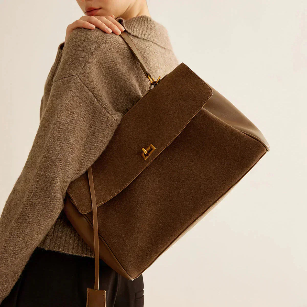Meet the Ciara Premium – A refined statement of modern elegance. Crafted with a harmonious blend of soft suede and high-quality vegan leather on the sides and back, this beautiful piece is finished with shiny gold-colored hardware. The versatile design switches effortlessly between shoulder and crossbody styles, making it perfect for any occasion.